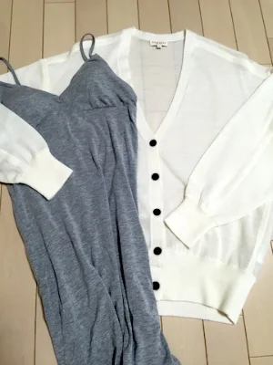 DEMYLEE(デミリー)のホワイトニットカーディガン/着た時のシルエットの美しさに感動。質感も透け感も完璧。グレーのロングキャミ/白より肌色より透けないグレー。下着感が無いのも◎ロングは腿までありドレスにも使えて本当に便利!