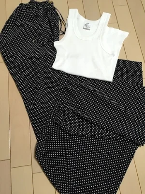 ヘビロテだったドゥーズイエムのドットワイドパンツ/軽くて楽チンでスリット入りで涼しい(笑)どんなトップスとも合わせやすくきれいめなコーデもできるので便利!HIKEコットンリブキャミソール/どこにでもあるキャミと思いきや、このシルエットのキレイさはスゴい!クオリティの高い生地と身体をきれいに見せるカット、リブの繊細なうねり。。24色あればいいのに〜!